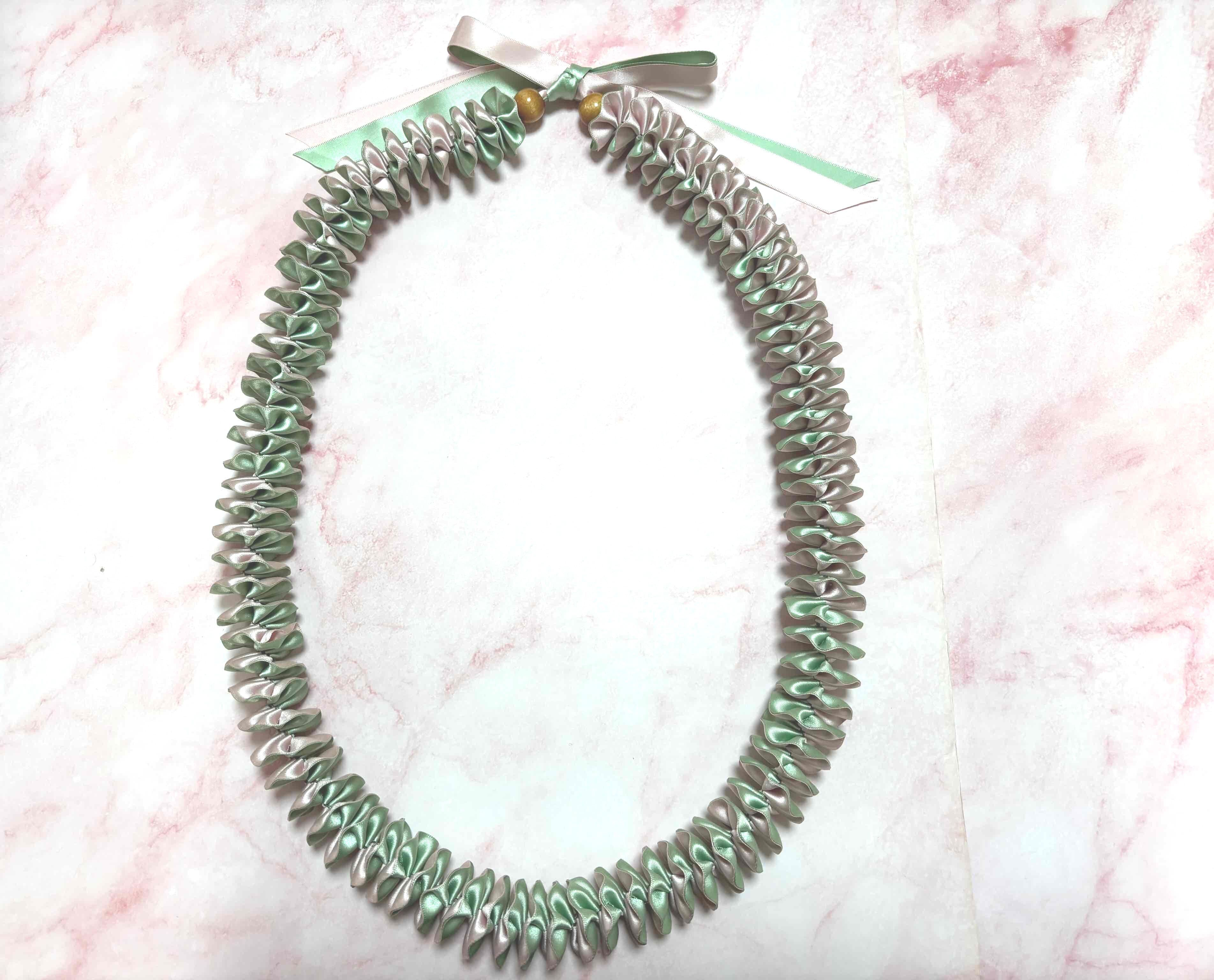 ◆リボンレイとは、レイを生花を使わず主にリボンやビーズ・造花などを使用して作るハワイアンクラフトです。レイはハワイの伝統的な装飾品で、ハワイに訪れた記念に観光客の首にかけられたり、日本ですとフラをされる方が身に着けたりするものと言えばわかりやすいかと思います。ハワイでは歓迎、誕生日、卒業式、結婚式などのお祝いにレイを贈り合います。
