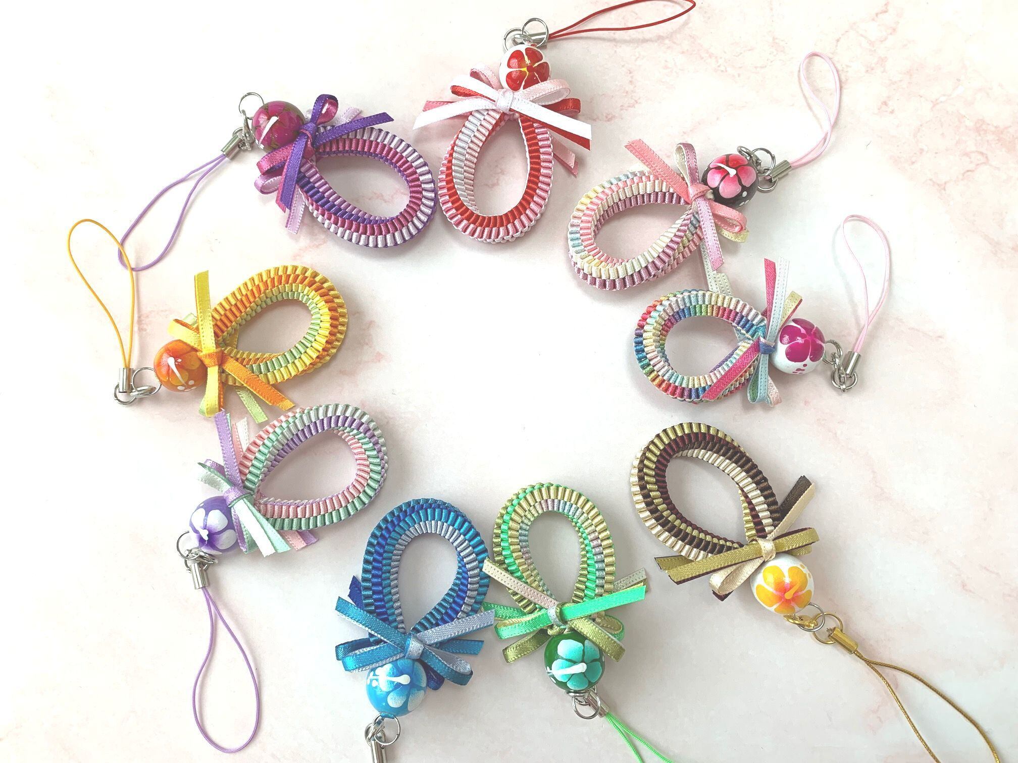 3mm幅のリボンを4色で手で編んでいくタイプのストラップです。
