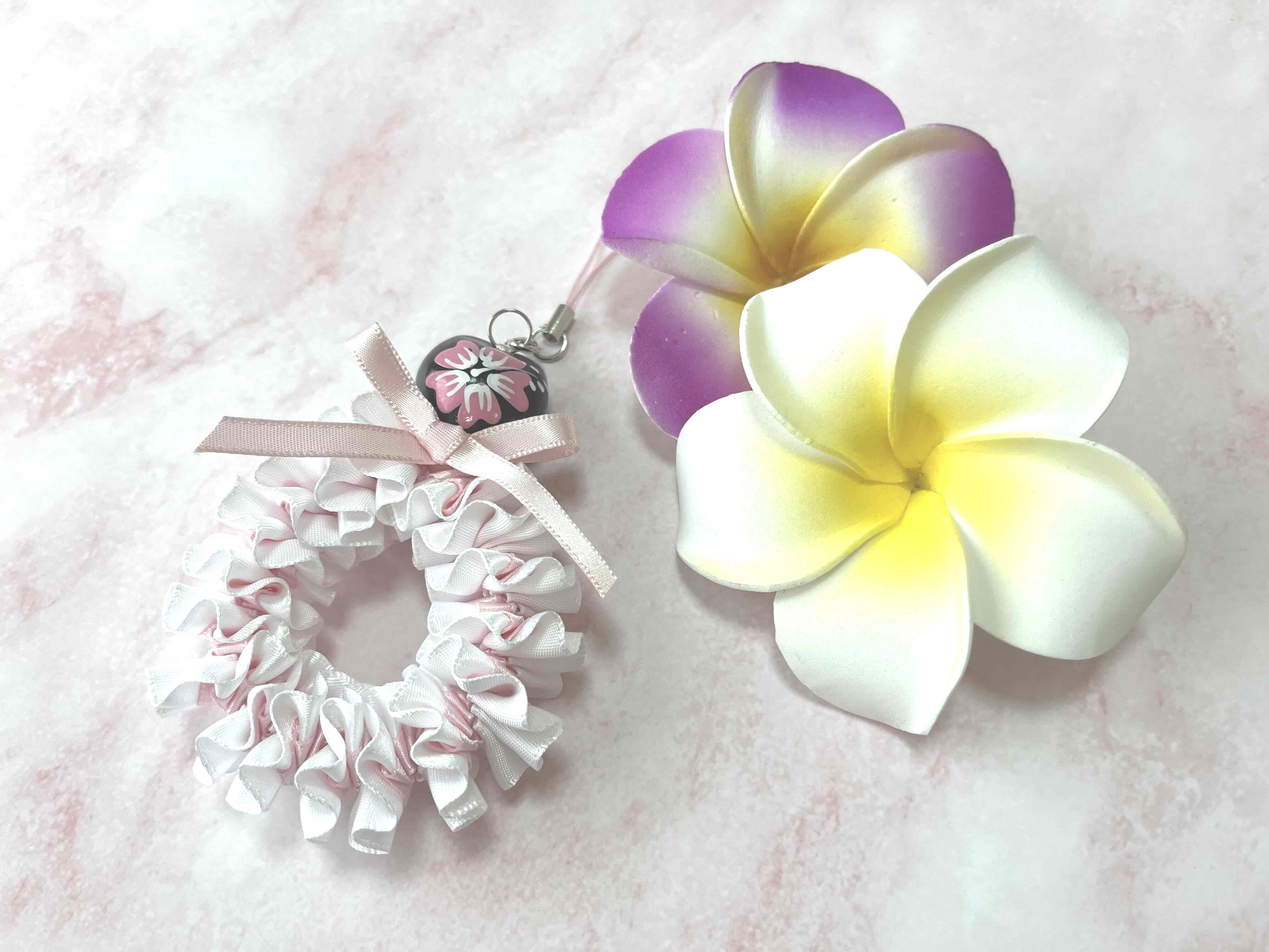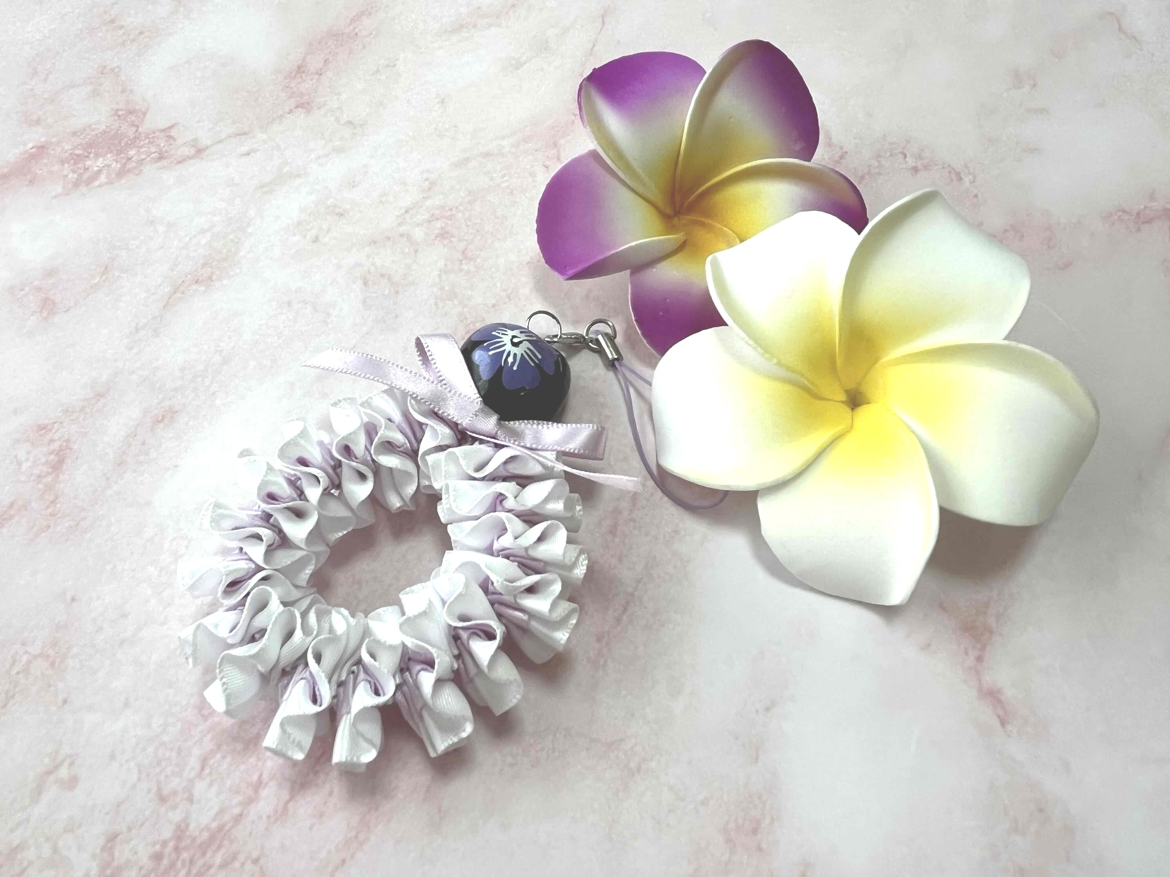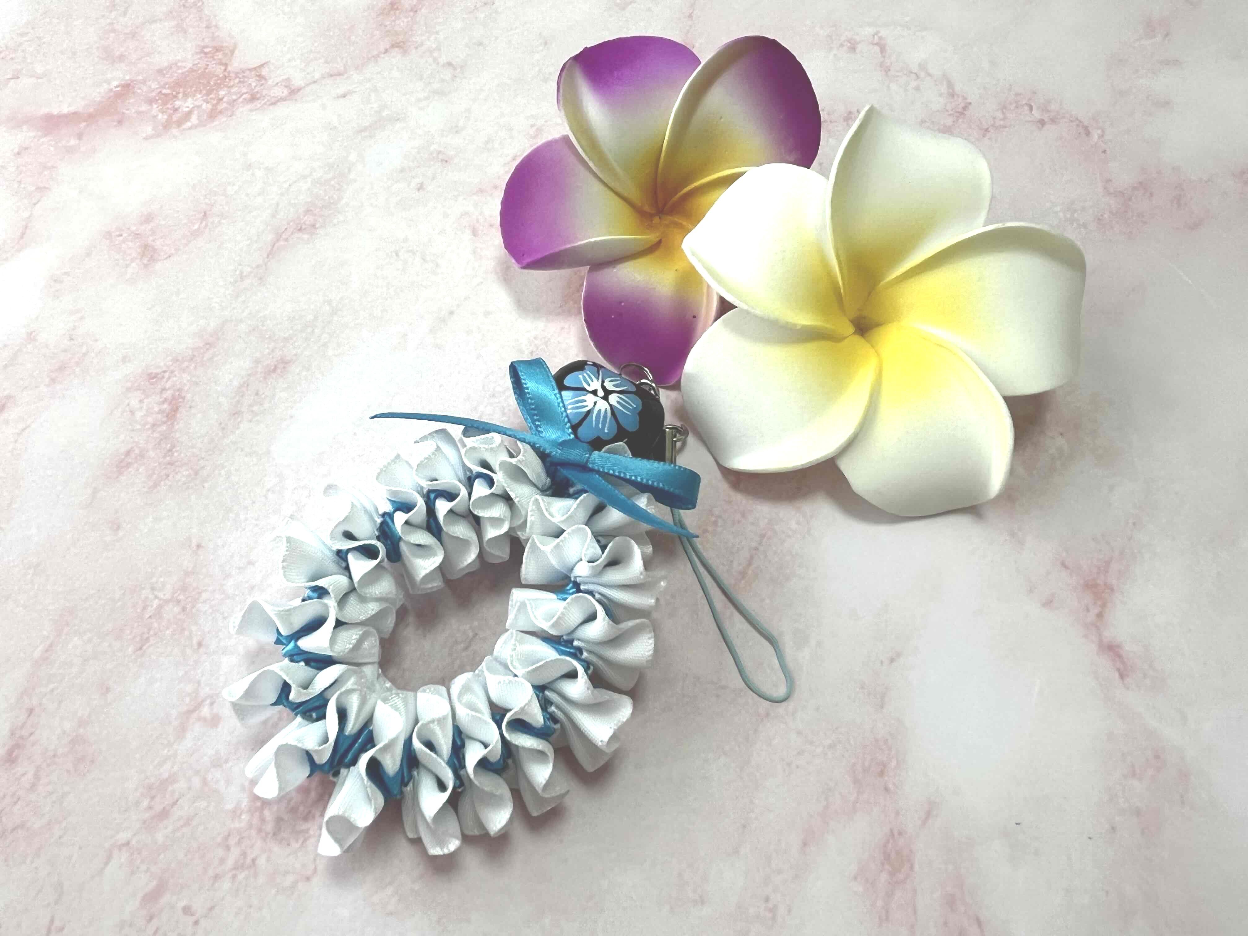 ハワイアンリボンレイ【プルメリアストラップ】キットです。