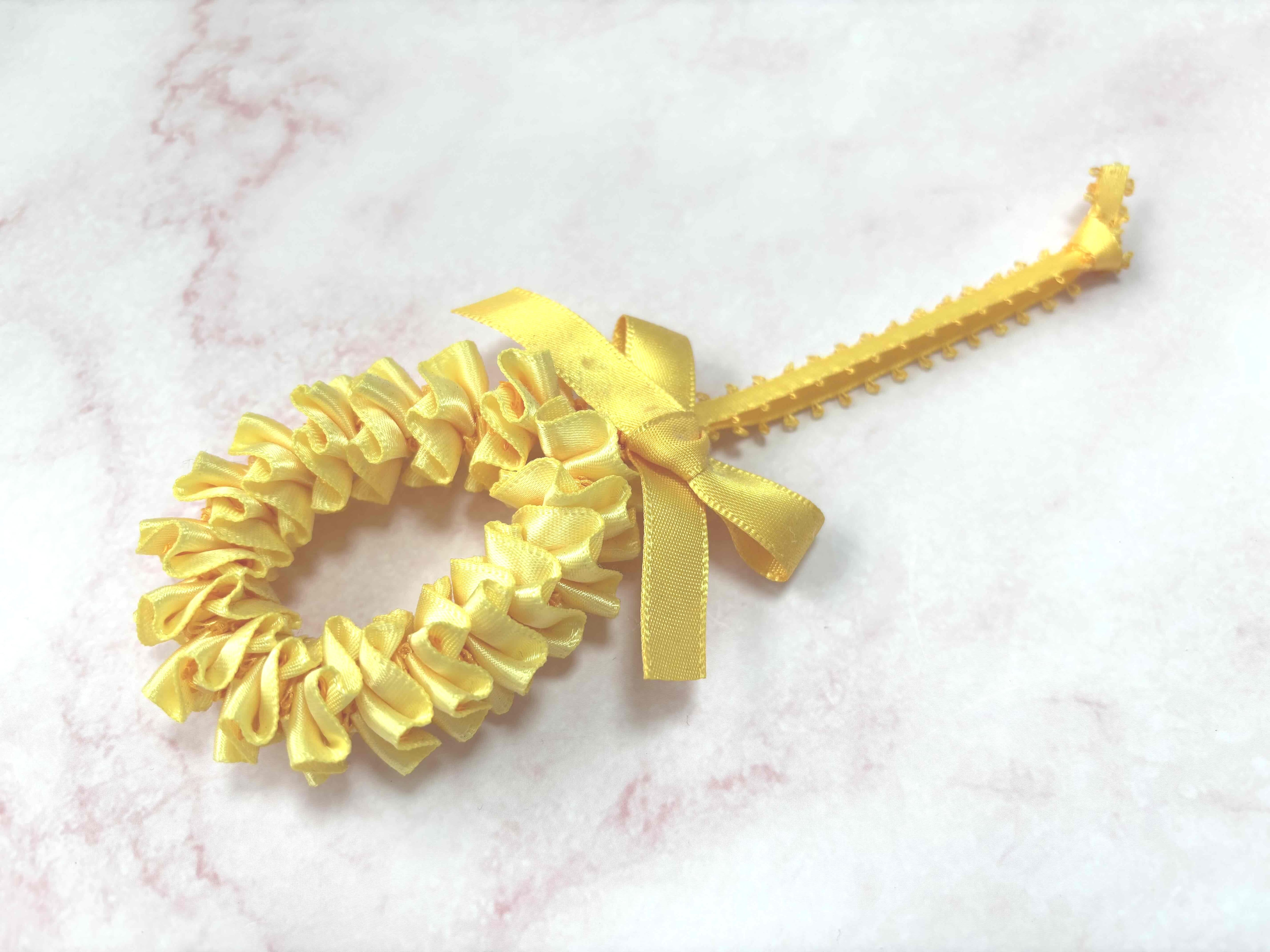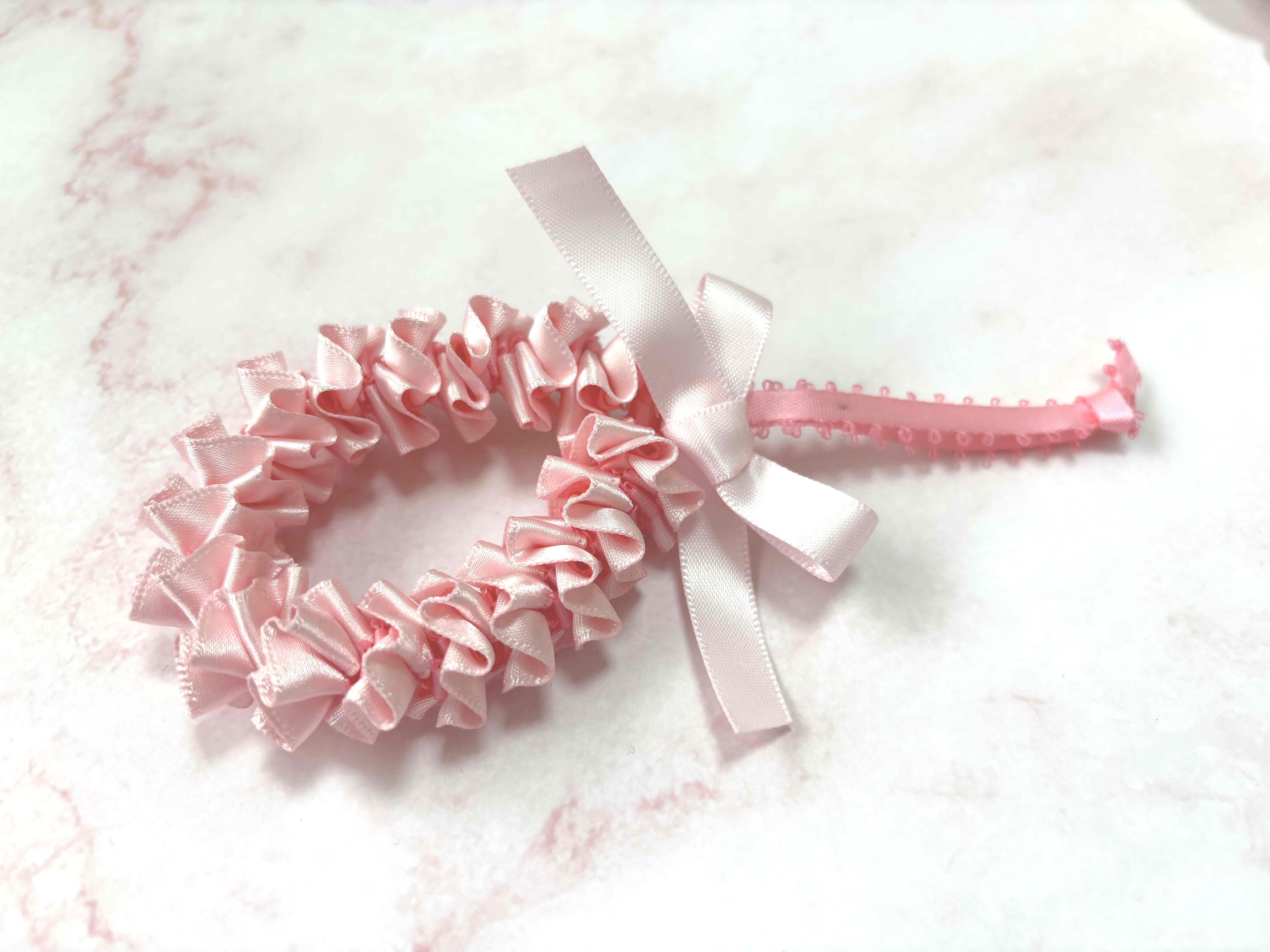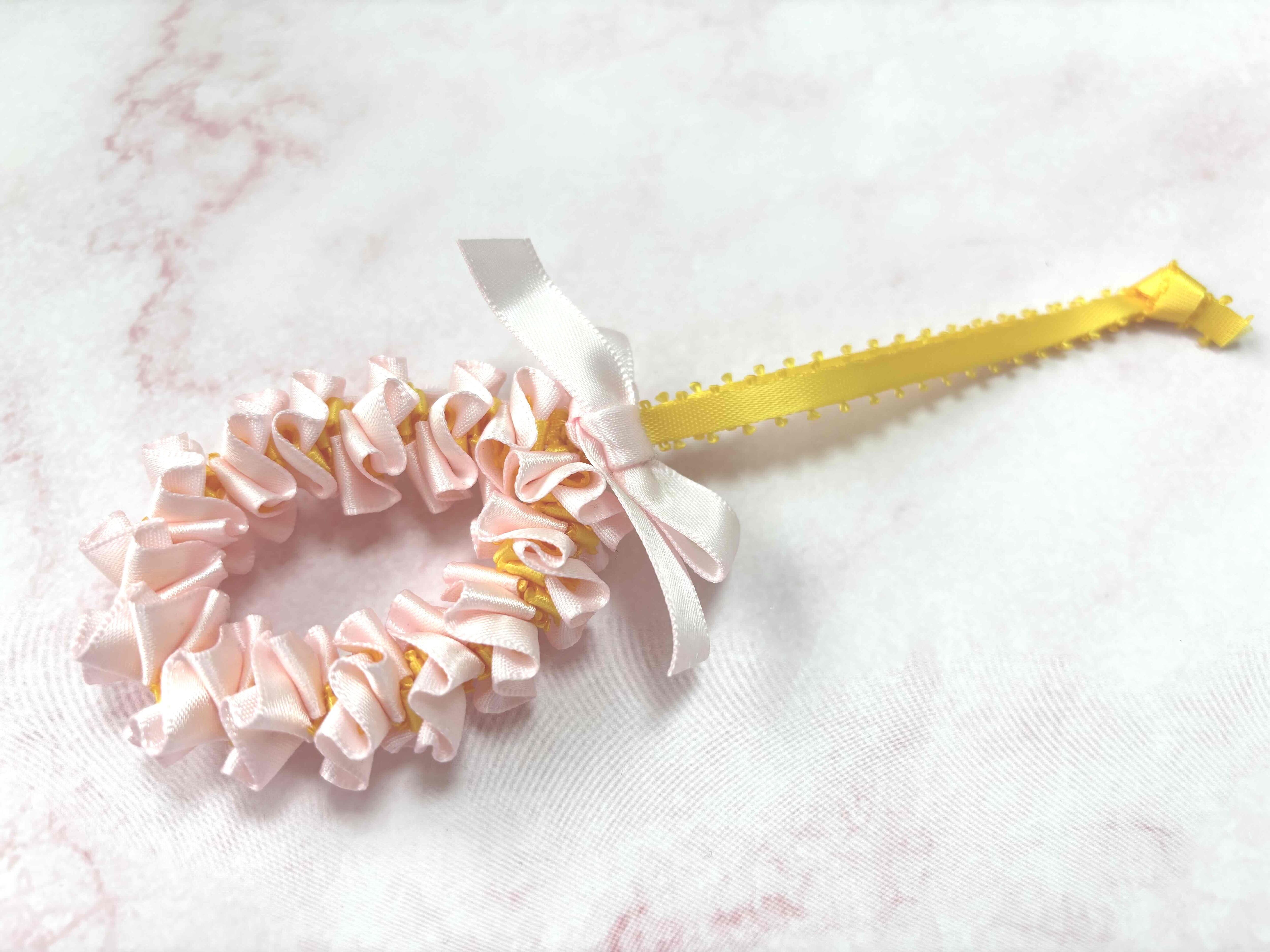 リボンを並み縫いしてプッシング(リボンを押しながら回転させる)していくストラップです。