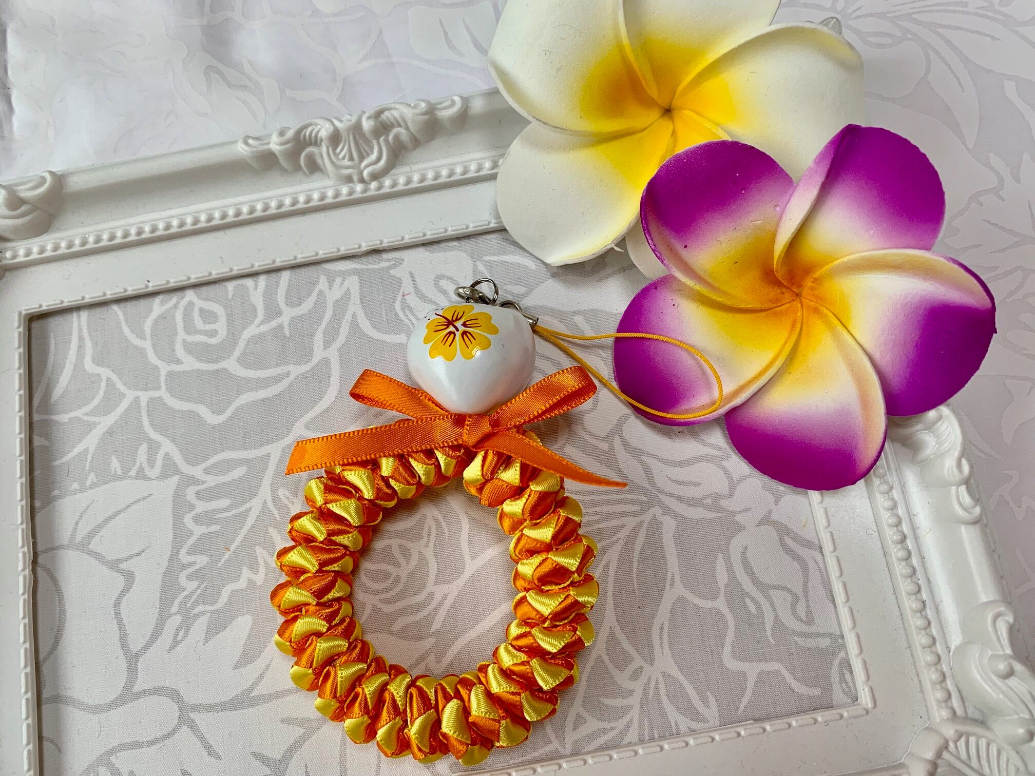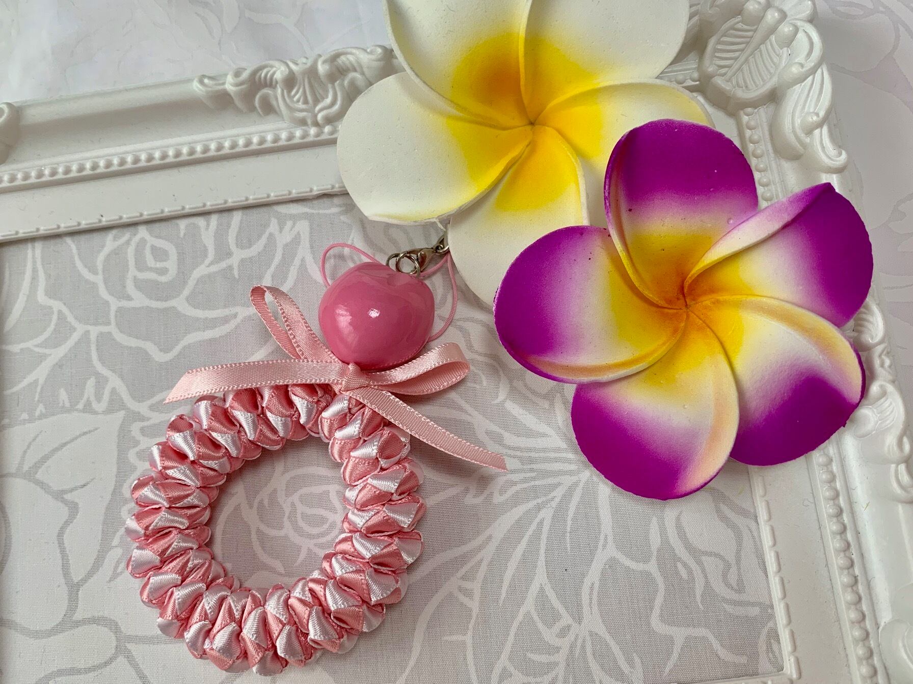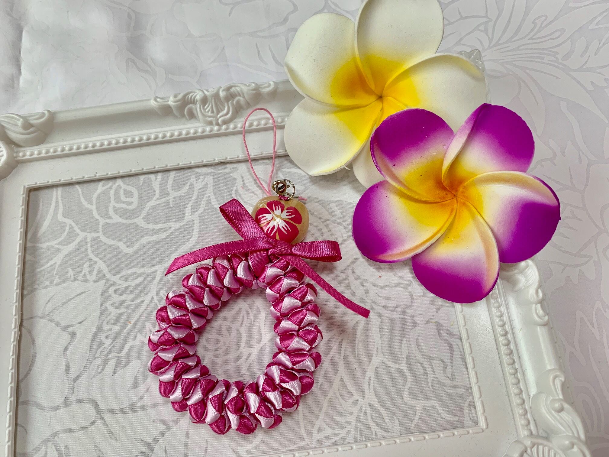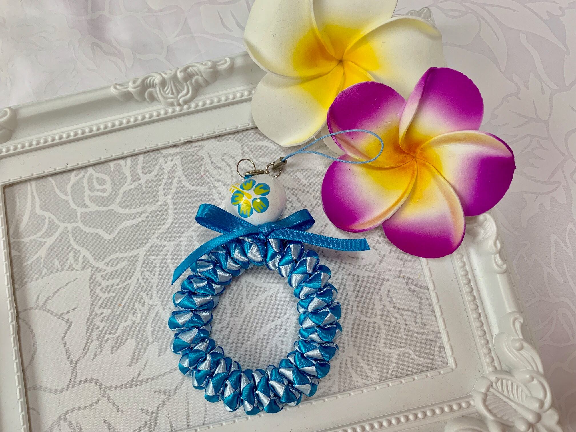 ◆リボンレイとは、レイを生花を使わず主にリボンやビーズ・造花などを使用して作るハワイアンクラフトです。レイはハワイの伝統的な装飾品で、ハワイに訪れた記念に観光客の首にかけられたり、日本ですとフラをされる方が身に着けたりするものと言えばわかりやすいかと思います。ハワイでは歓迎、誕生日、卒業式、結婚式などのお祝いにレイを贈り合います。