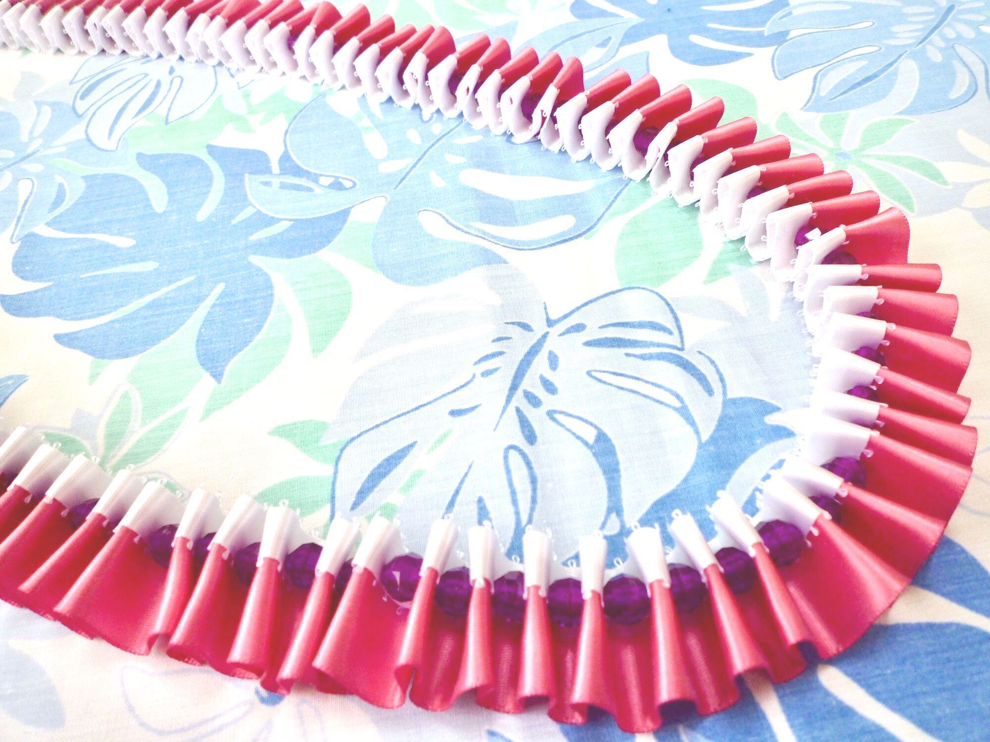 ◆リボンレイとは、レイを生花を使わず主にリボンやビーズ・造花などを使用して作るハワイアンクラフトです。レイはハワイの伝統的な装飾品で、ハワイに訪れた記念に観光客の首にかけられたり、日本ですとフラをされる方が身に着けたりするものと言えばわかりやすいかと思います。ハワイでは歓迎、誕生日、卒業式、結婚式などのお祝いにレイを贈り合います。
