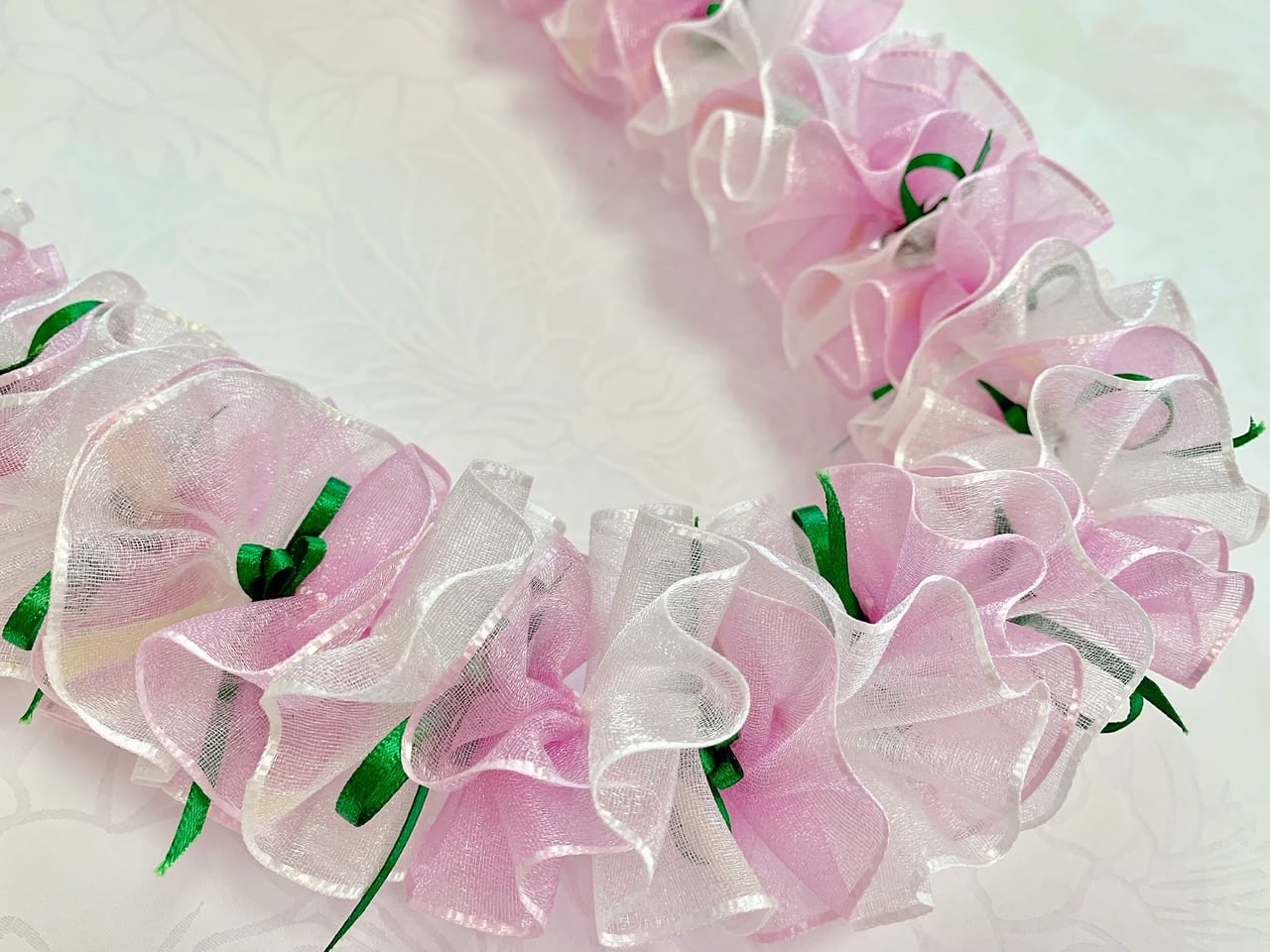 ◆リボンレイとは、レイを生花を使わず主にリボンやビーズ・造花などを使用して作るハワイアンクラフトです。レイはハワイの伝統的な装飾品で、ハワイに訪れた記念に観光客の首にかけられたり、日本ですとフラをされる方が身に着けたりするものと言えばわかりやすいかと思います。ハワイでは歓迎、誕生日、卒業式、結婚式などのお祝いにレイを贈り合います。
