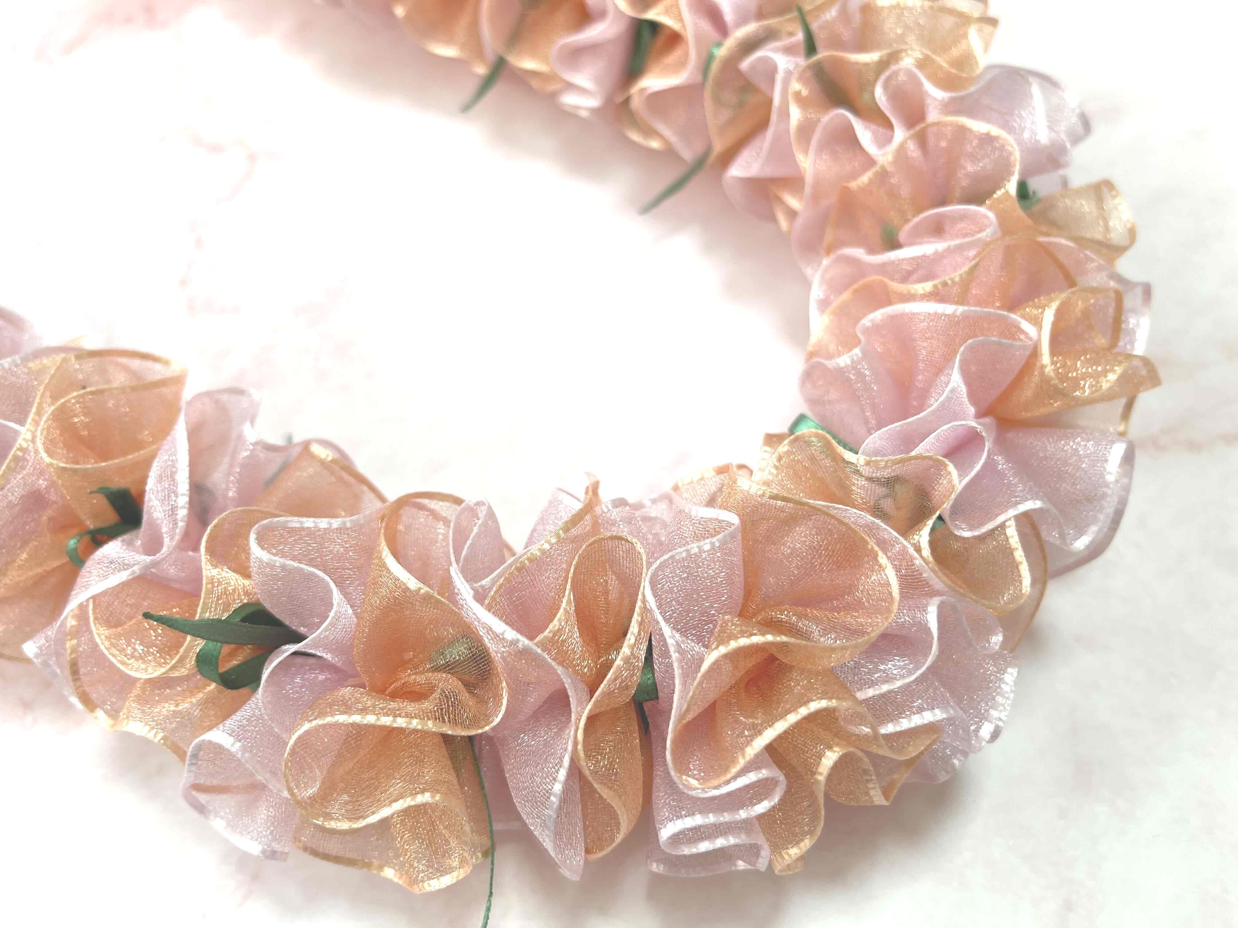 オーガンジーリボンで1個1個お花を作ってから糸に通していきます。