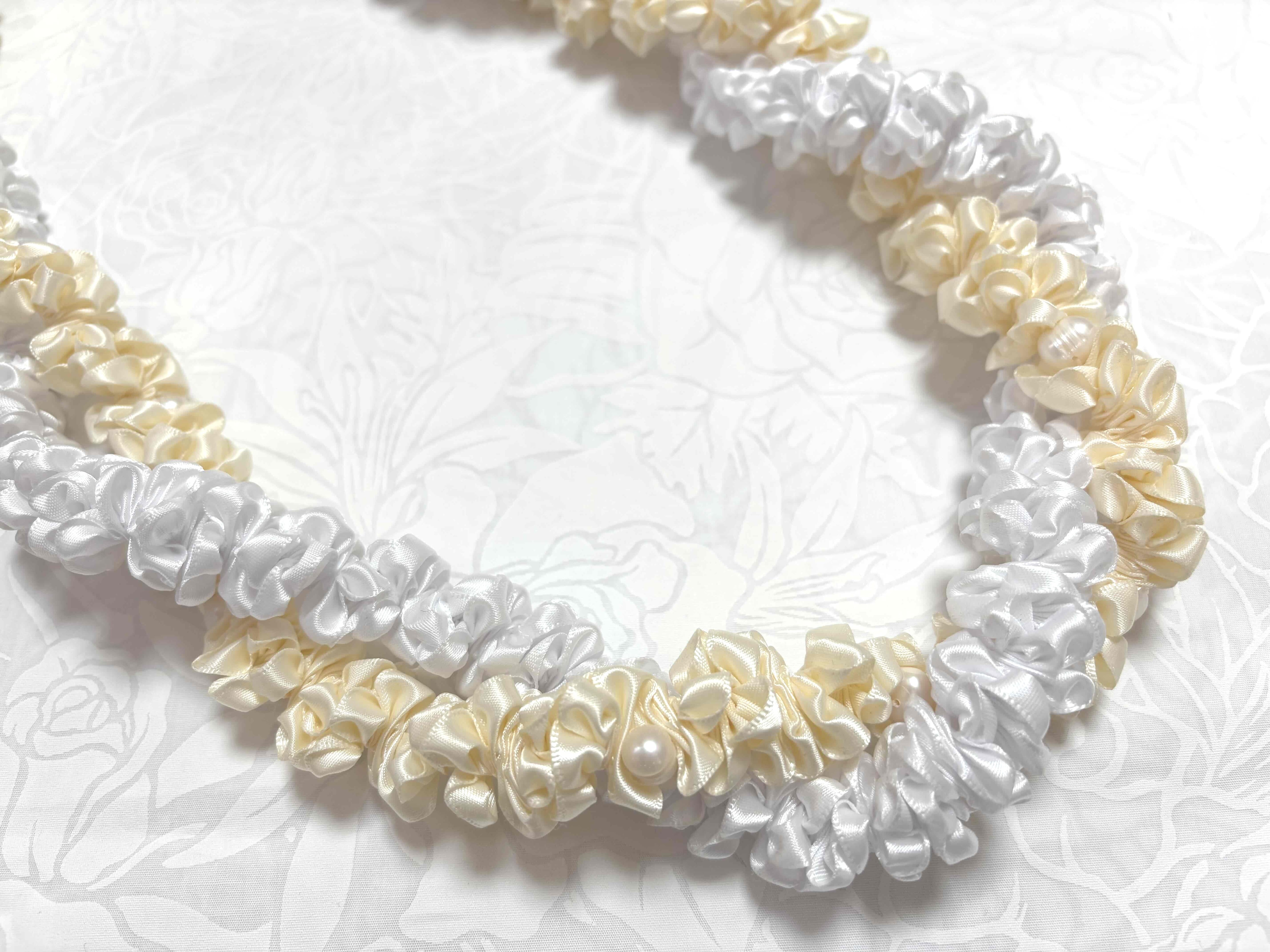 ◆リボンレイとは、レイを生花を使わず主にリボンやビーズ・造花などを使用して作るハワイアンクラフトです。レイはハワイの伝統的な装飾品で、ハワイに訪れた記念に観光客の首にかけられたり、日本ですとフラをされる方が身に着けたりするものと言えばわかりやすいかと思います。ハワイでは歓迎、誕生日、卒業式、結婚式などのお祝いにレイを贈り合います。◆インストラクターコース・小物の資格取得・ウエディングの資格・通信講座も行っております。
