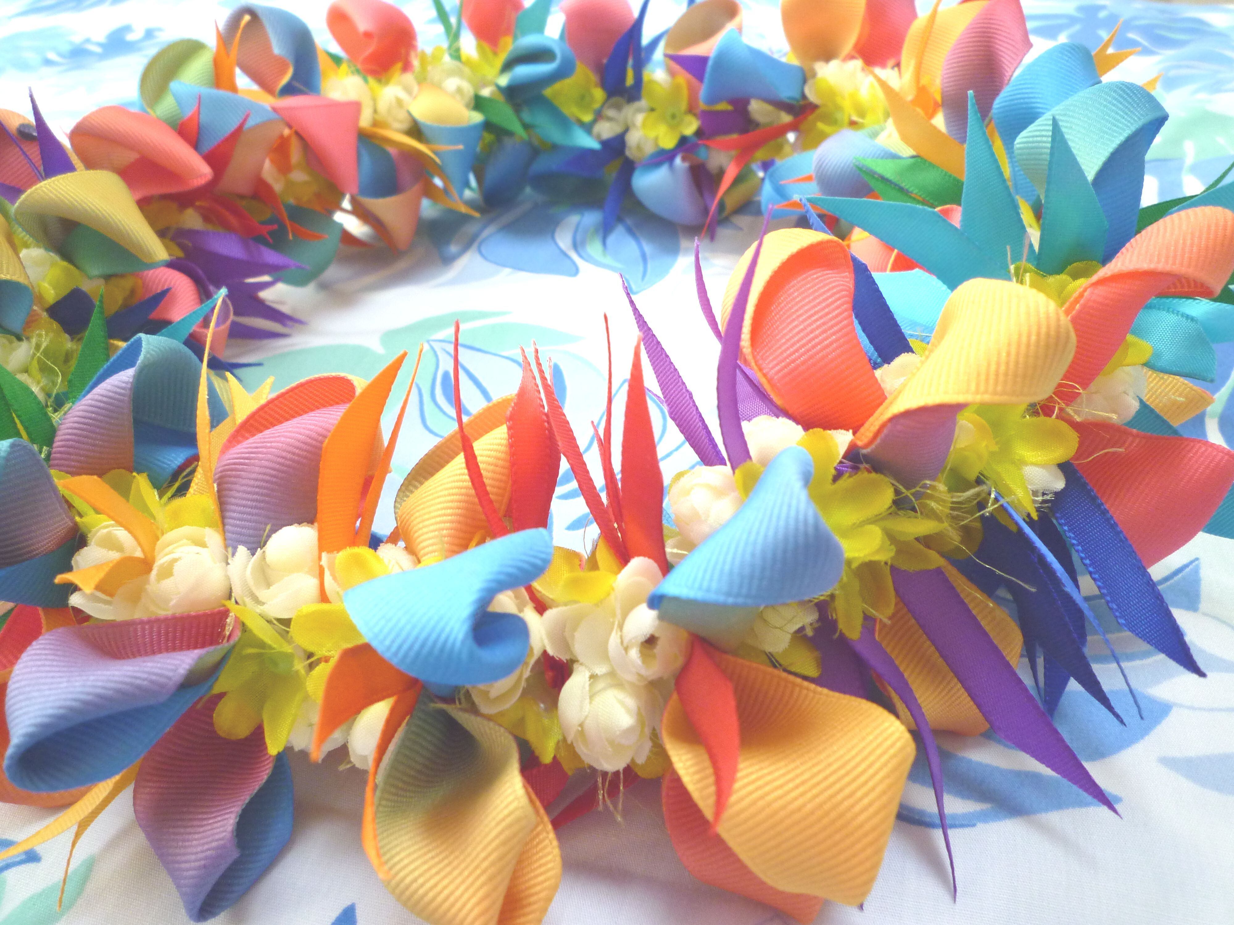 ◆リボンレイとは、レイを生花を使わず主にリボンやビーズ・造花などを使用して作るハワイアンクラフトです。レイはハワイの伝統的な装飾品で、ハワイに訪れた記念に観光客の首にかけられたり、日本ですとフラをされる方が身に着けたりするものと言えばわかりやすいかと思います。ハワイでは歓迎、誕生日、卒業式、結婚式などのお祝いにレイを贈り合います。