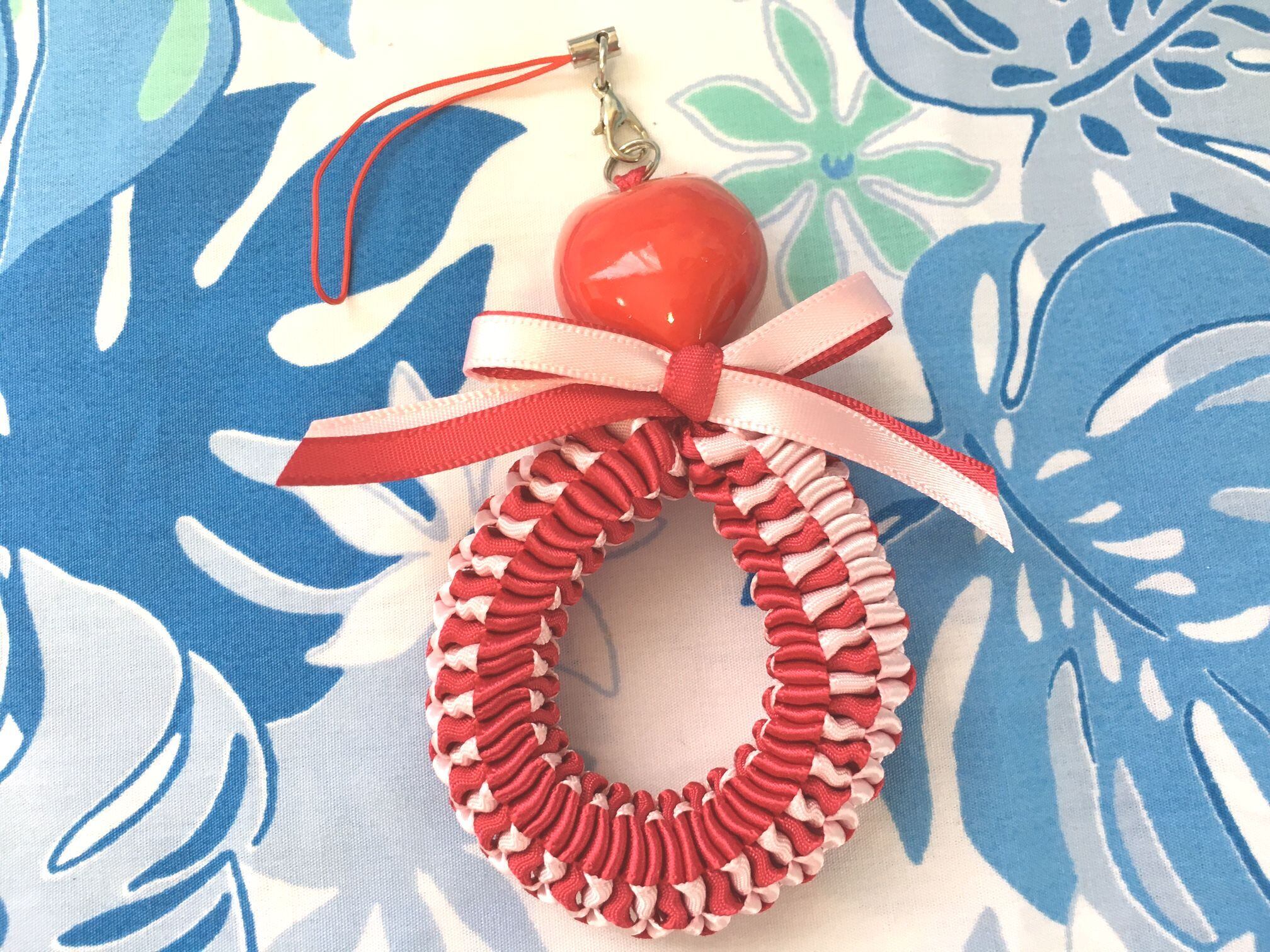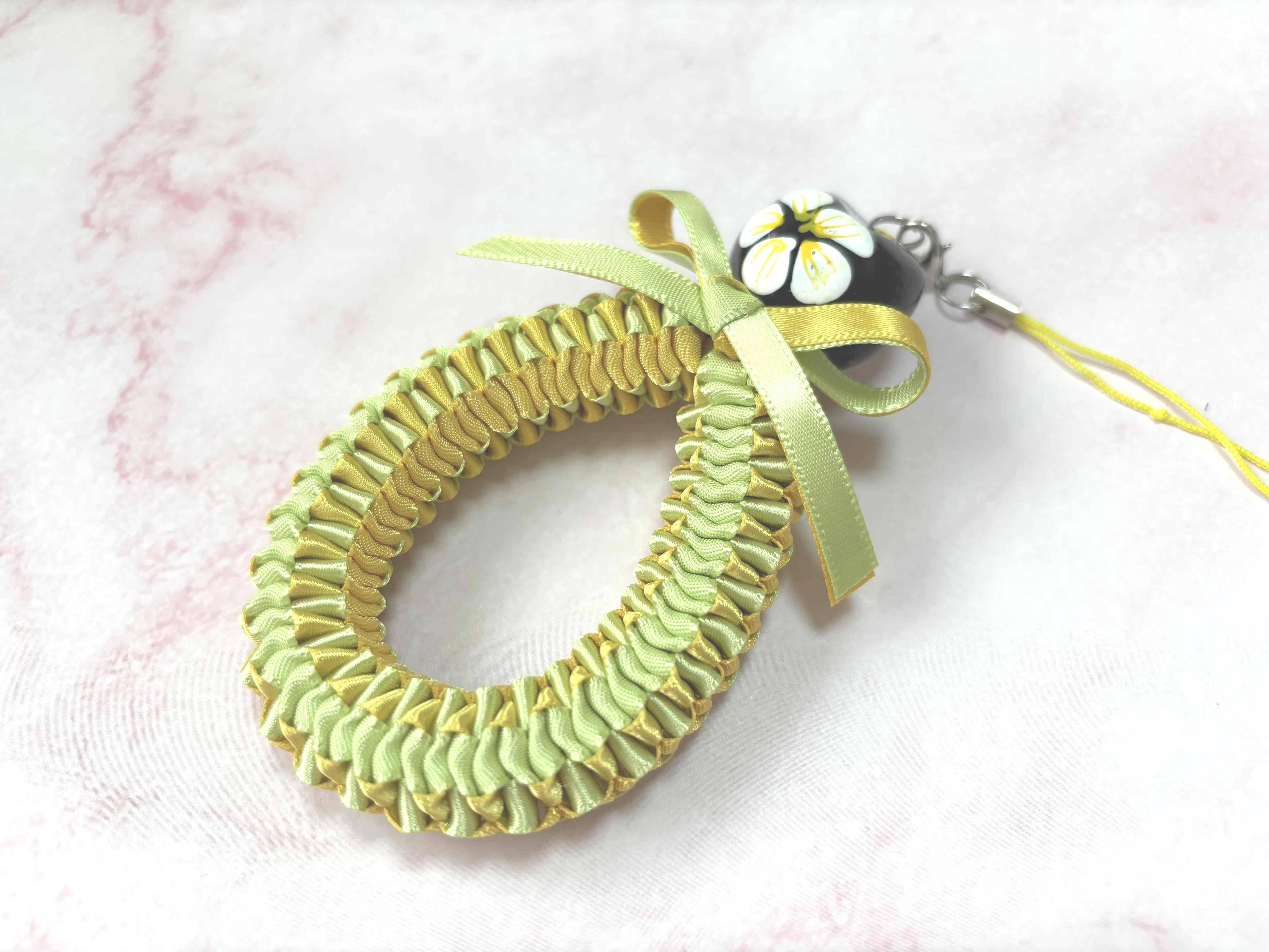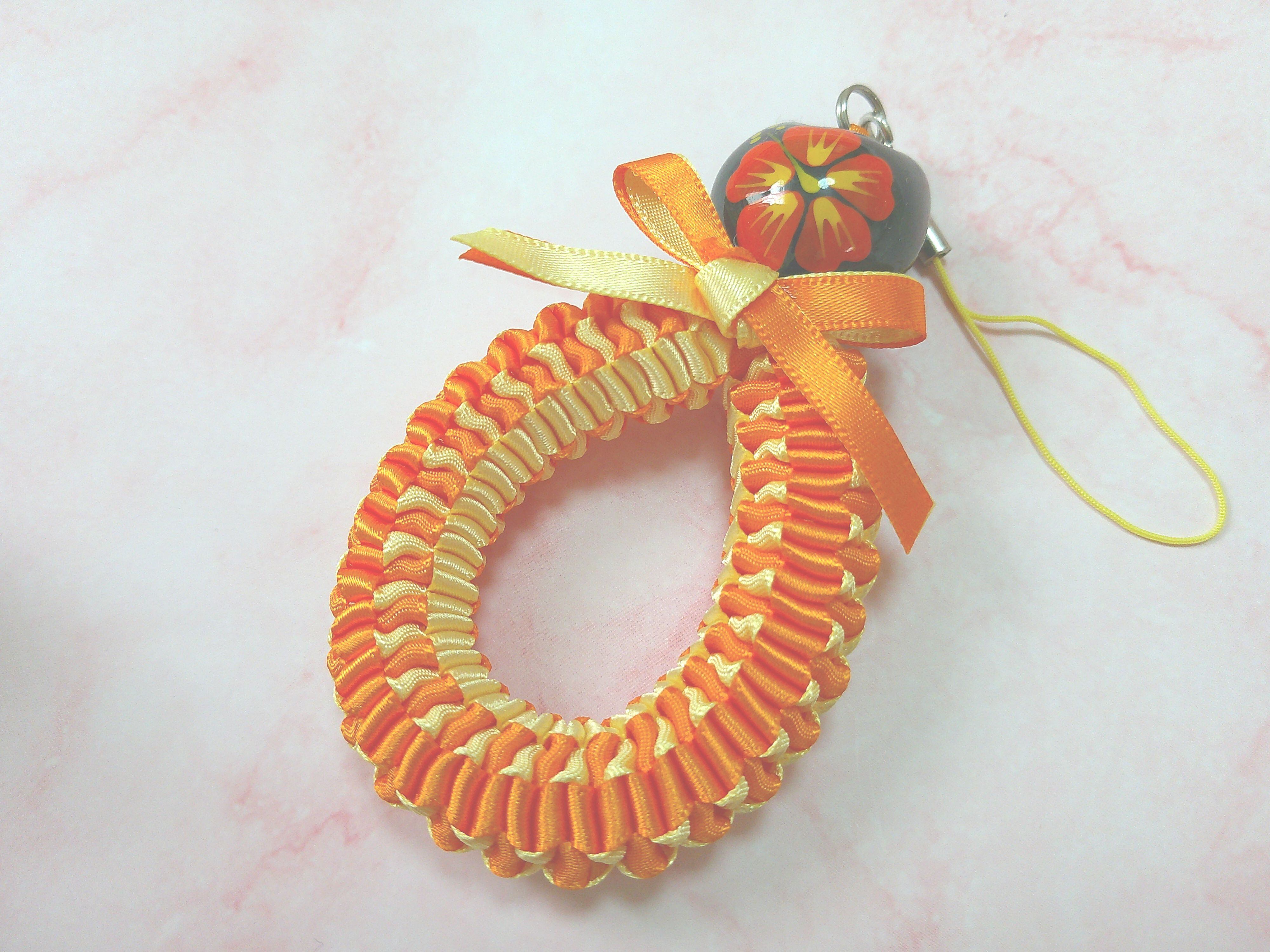 2色のリボンを手で編んでいくタイプのストラップです。