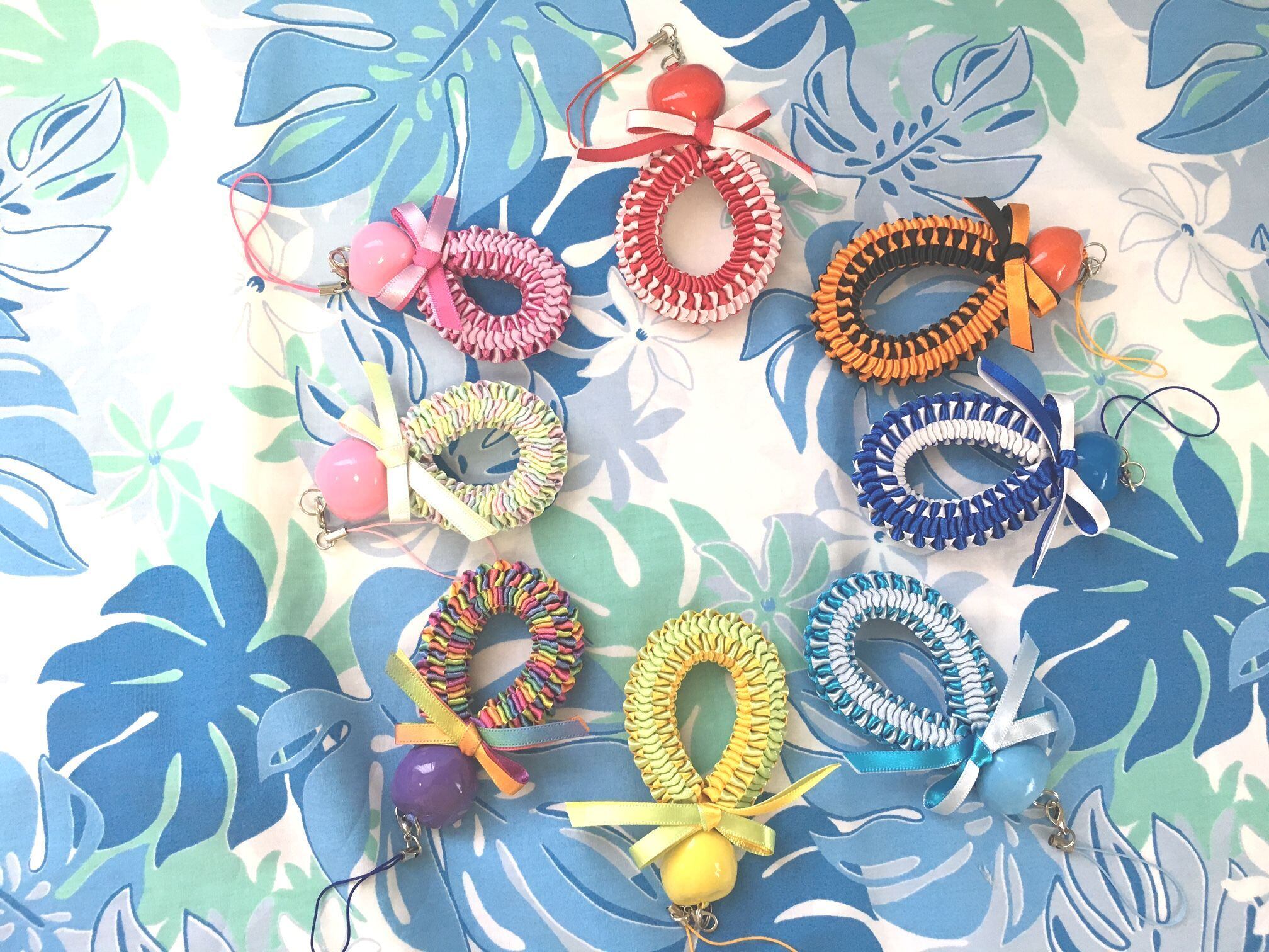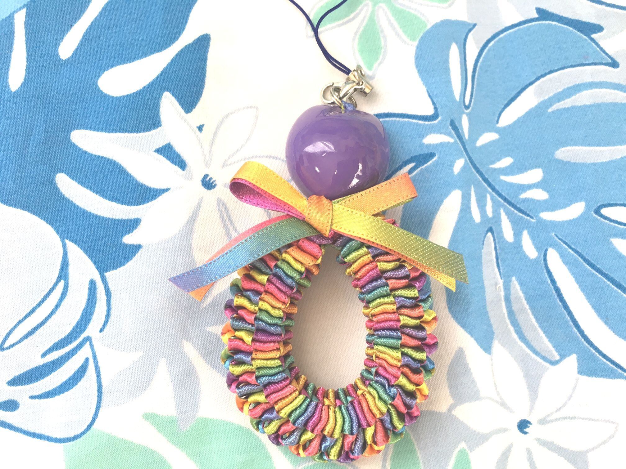 ◆リボンレイとは、レイを生花を使わず主にリボンやビーズ・造花などを使用して作るハワイアンクラフトです。レイはハワイの伝統的な装飾品で、ハワイに訪れた記念に観光客の首にかけられたり、日本ですとフラをされる方が身に着けたりするものと言えばわかりやすいかと思います。ハワイでは歓迎、誕生日、卒業式、結婚式などのお祝いにレイを贈り合います。