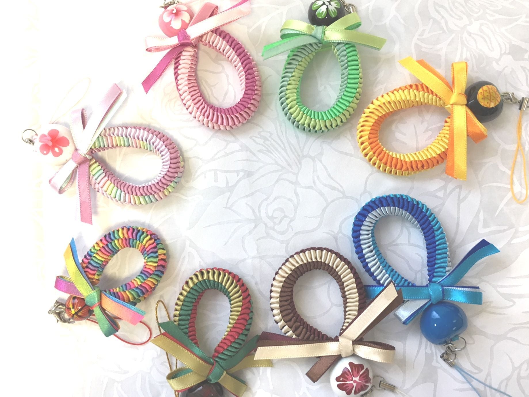 ◆リボンレイとは、レイを生花を使わず主にリボンやビーズ・造花などを使用して作るハワイアンクラフトです。レイはハワイの伝統的な装飾品で、ハワイに訪れた記念に観光客の首にかけられたり、日本ですとフラをされる方が身に着けたりするものと言えばわかりやすいかと思います。ハワイでは歓迎、誕生日、卒業式、結婚式などのお祝いにレイを贈り合います。